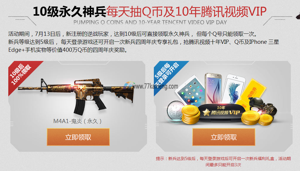新兵等级达到5级后, 每天登录游戏还可开启一次新兵四周年庆专享礼包,抢腾讯视频十年VIP、Q币及IPhone 三星Edge+手机实物等价值400万Q币的四周年庆奖励。