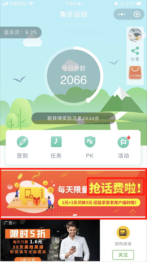 微信搜索“集步运动”小程序之后点进去,全部同意点进去之后可以看到下图红框圈起来的“抢话费”的一张宣传图,直接点图进去即可参与。