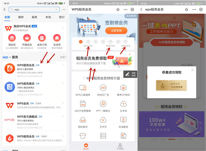 如何免费领取27天WPS稻壳会员?此方法亲测秒到账 打开支付宝APP 首页搜索【wps】 点击【wps稻壳会员】进去 完成7天签到可领取9天会员,然后点击中间横幅【稻壳会员免费领取】进去输入手机号即可领取15天会员!