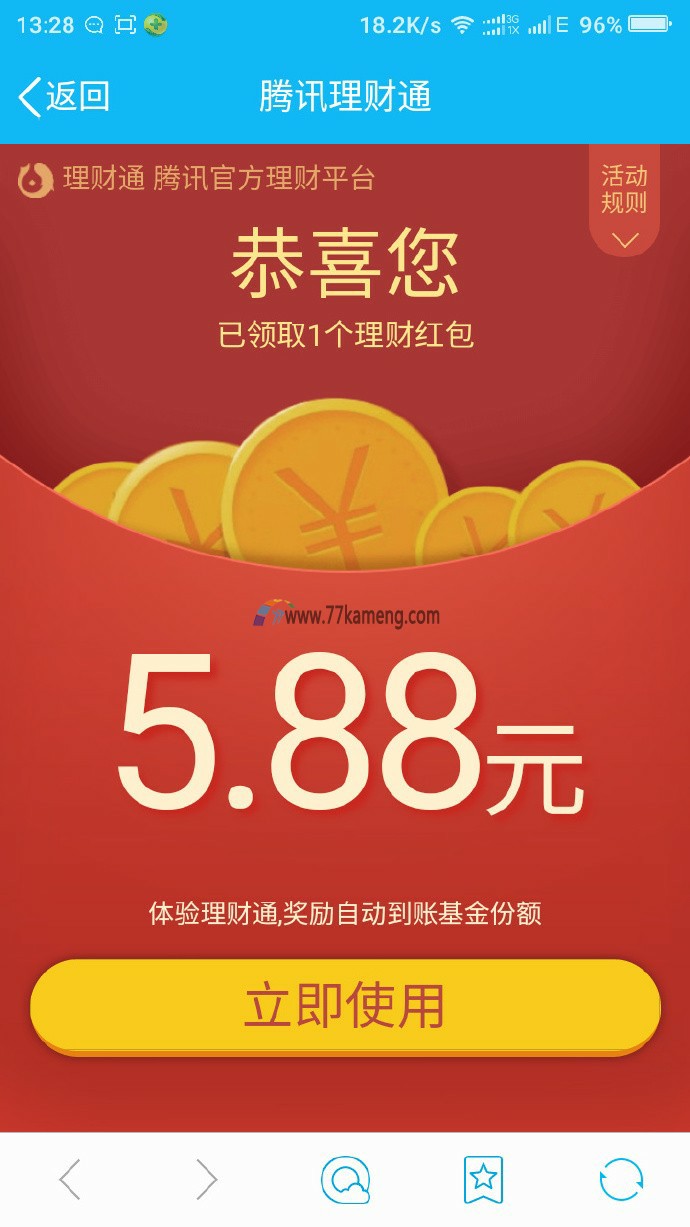 6月22最新手Q理财通100%领取5.88元理财通红包 买入1000元活期提现,有兴趣的看看,