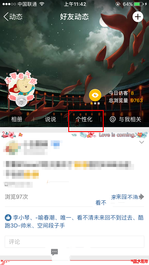 1、首先你进入到手机空间里面,进入好友动态---个性化,如图所示。