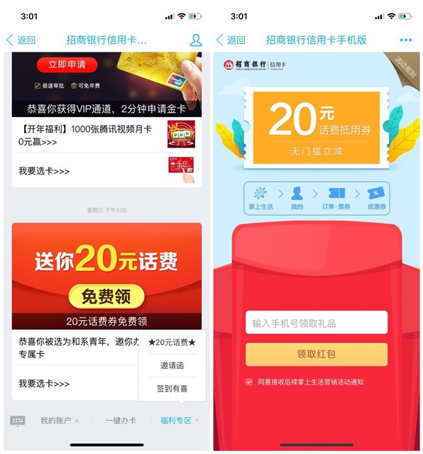 手机QQ打开搜索公众号“招商银行信用卡手机版”,打开以后点击福利专区 - 20元话费,输入还没注册的手机号然后领取,领取以后登录掌上生活APP注册额,在我的 - 订单票券 - 优惠券中使用,活动可以10元充值30元话费,有需要并且满足条件的朋友可以上,小编早已不是新用户了,77生活网的小伙伴们有感兴趣的可以试试。