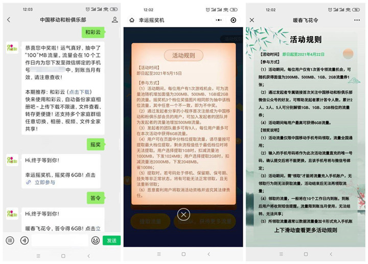 粉俱乐部免费领取100M-1G日包移动流量活动 微信关注【中国移动和粉俱乐部】公众号 进去发送【和彩云】、【摇奖】、【答令】 后面两个口令点推文进去参加两个活动,必中流量,然后手动兑换即可!仅限移动用户参与活动!