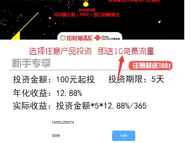 投资任意以产品就送1G免费联通流量 这个投资就是100 期限是5天