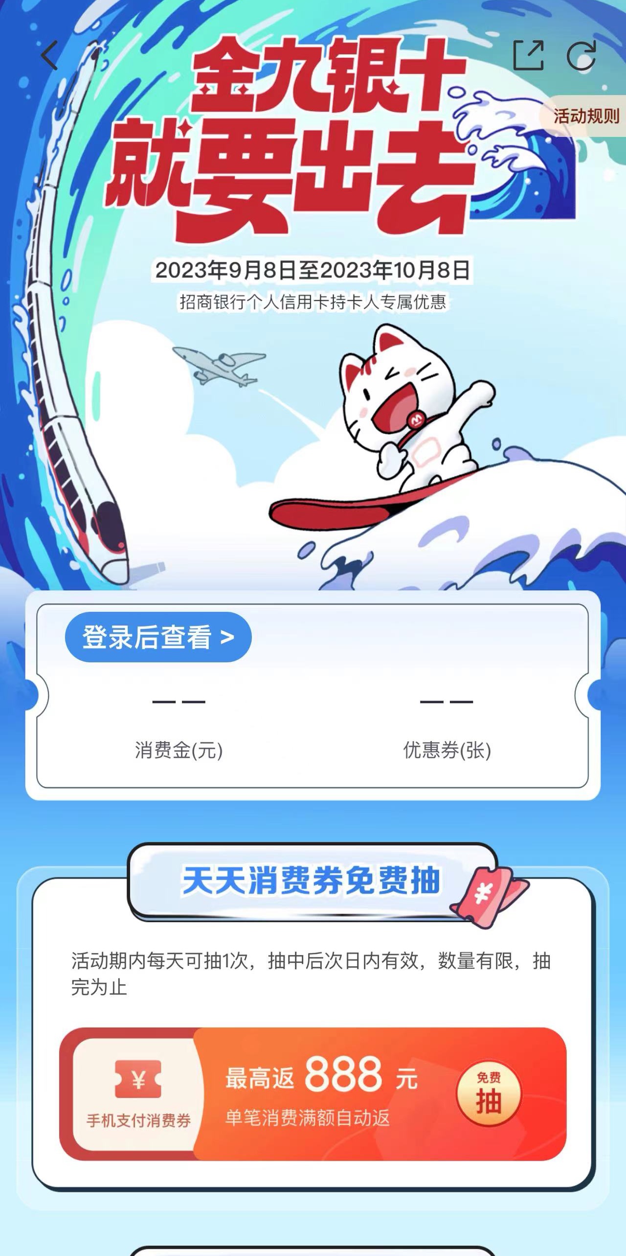 银行信用卡作为我国消费金融“主力军”,是提振消费的重要参与者之一。继今年上半年推出“五一游玩,小招有礼”“618笔笔返现”等一系列备受广大消费者喜爱的活动之后,招商银行信用卡在9月8日再度加码推出“金九银十”主题营销,为持卡人的假期消费提供给力优惠,积极推动消费潜力释放。