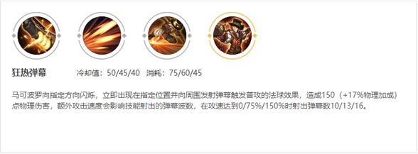 解析:马可波罗向指定方向闪烁,立即出现在指定位置并向周围发射弹幕触发普攻的法球效果,造成150(+17%物理加成)点物理伤害,额外攻击速度会影响技能射出的弹幕波数,攻速越高伤害越高。